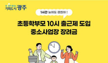 육아기 자녀 둔 부모 '10시 출근제'…사업주 지원 직장인의 양육 부담 해소를 위해 시행하고 있는 '초등학부모 10시 출근제'가 내년부터 전국으로 확대된다.광주시는 '초등학부모 10시 출근제'가 이재명 정부의 일·가정 양립 지원 대책인 '육아기 10시 출근제'에 반영돼 2026년부터 본격 운영된다고 7일 밝혔다.'초등학부모 10시 출근제'는 광주시가 지난 2022년 부터 시행하고 있다.300인 미만 중소기업… 01-22 -